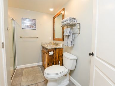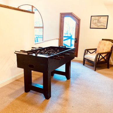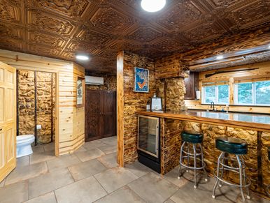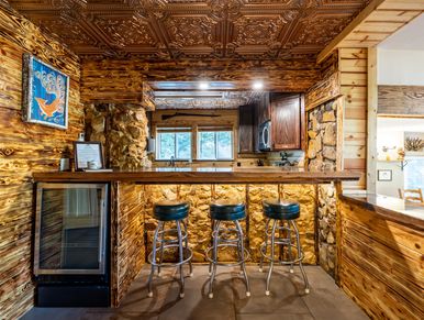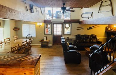 The 2500 sqft home has natural stone and cedar siding. Enter the home to the open living room/ dining room with large stone fireplace. Continue to the kitchen with open bar area and half bath in the hall. The four bedrooms are all upstairs with the two bathrooms. Each bedroom has its own temperature control unit with individual remotes. The second floor provides a loft area with second TV lounge as well as an area off the front balcony with a Foosball table.