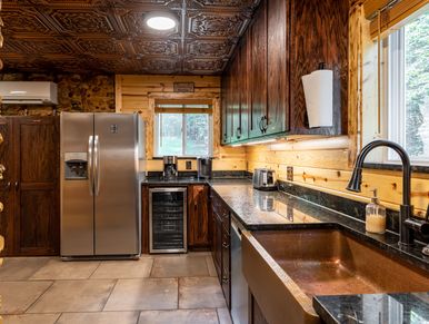 Copper sink and pot filler above stove. The pantry is stocked with basic household needs such as spices, oils, baking essentials, etc.