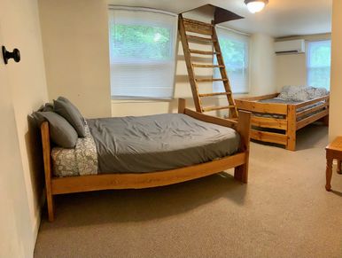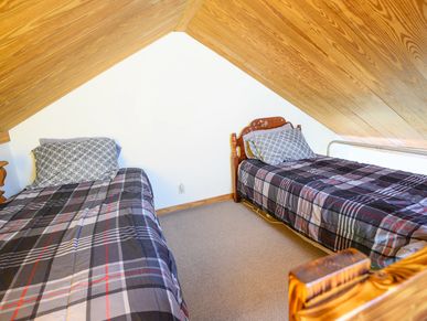 Bedroom 4 is located at the top far right of the stairs at the end of the hall. This room consists of a two double beds and loft with two additional single beds.