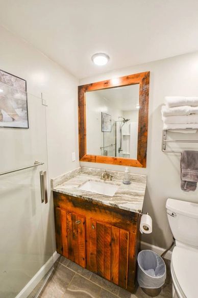 Master en-suite reclaimed wood vanity. Wood reclaimed from the first floor renovation.
