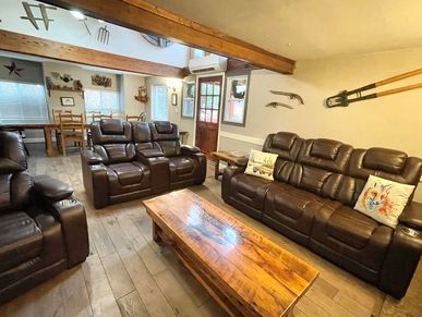 Large recliner sectional couch and rocking recliner. Table was made by the reclaimed wood from the original living room floor refinishing.